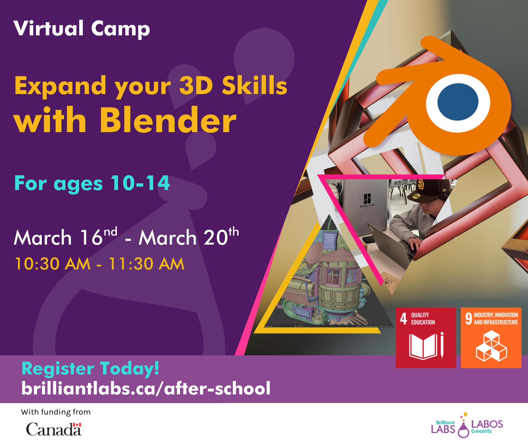 Join us for this virtual March Break Camp, all you need is a computer and an internet connection! In this program students will get an introduction to one the biggest 3D design platforms, Blender that can be used for everything from animation to VFX to even designing video games!