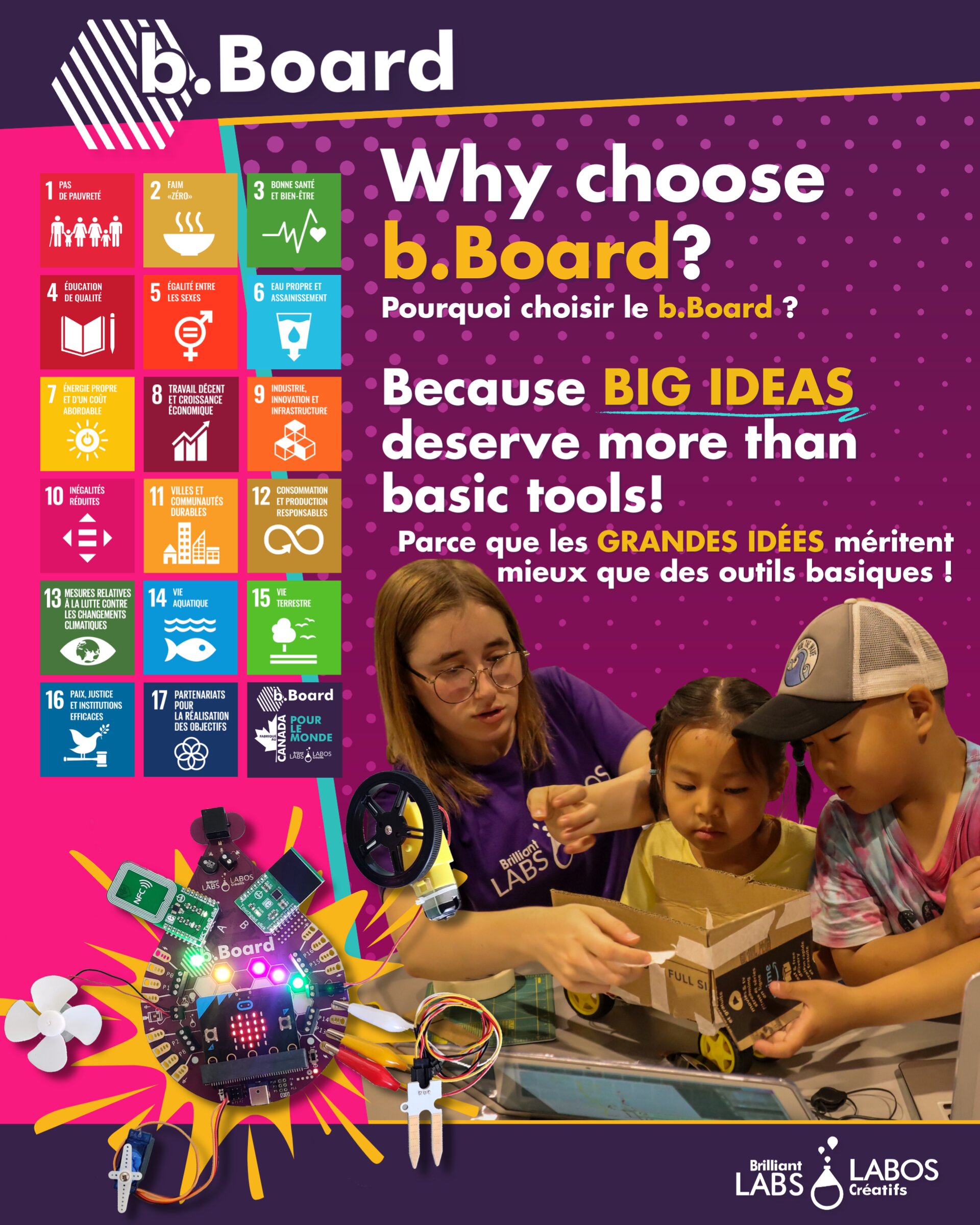 Bring the power of creation to your classroom or makerspace with the b.Board, proudly designed and built in Dieppe, New Brunswick. This open-source prototyping platform lets students experiment with coding, electronics, and design, whether they’re just starting out or tackling real-world challenges linked to the UN Sustainable Development Goals.